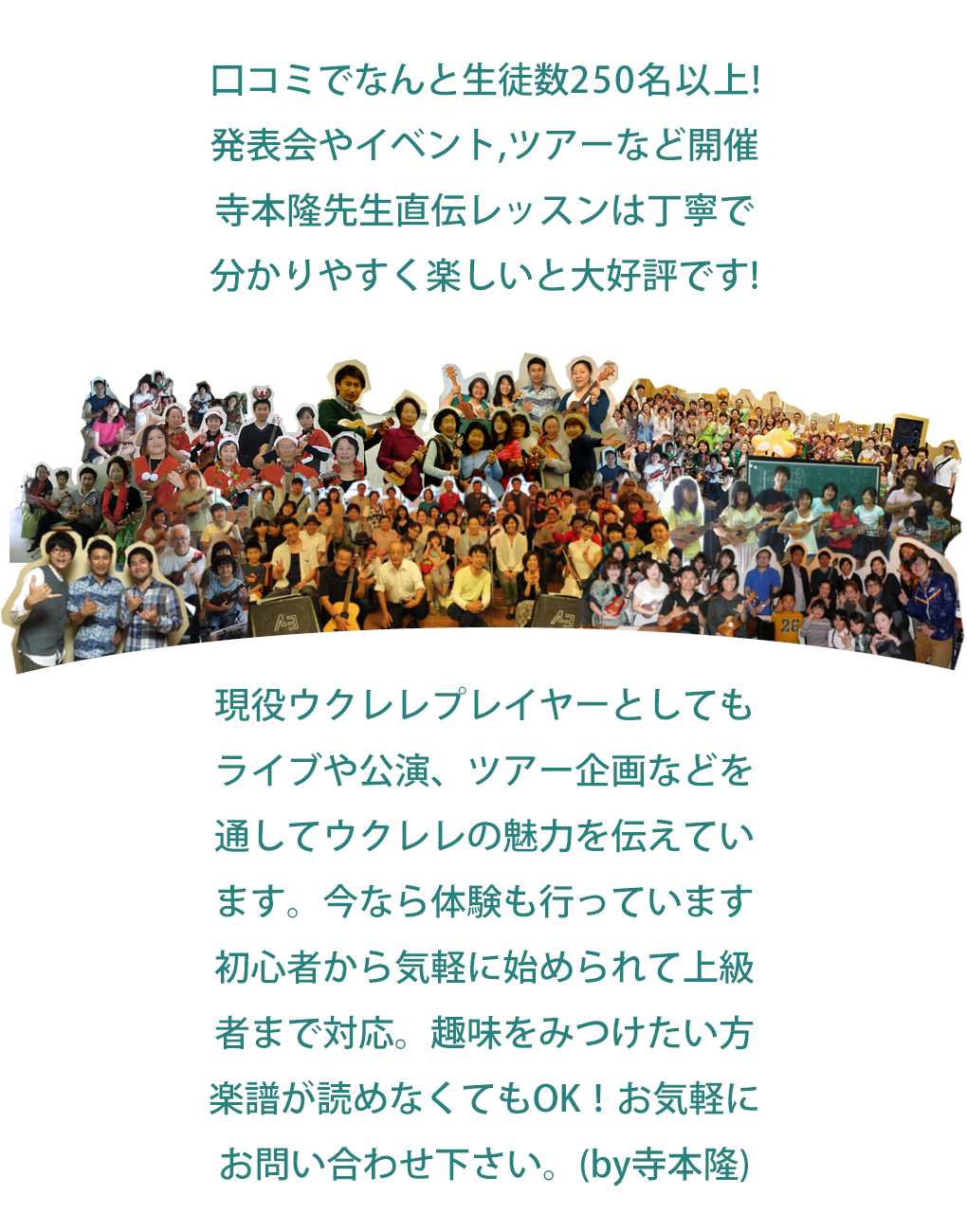 口コミでなんと生徒数250名以上! 発表会やイベント,ツアーなど開催 寺本隆先生直伝レッスンは丁寧で 上達が早く楽しいと大好評です!